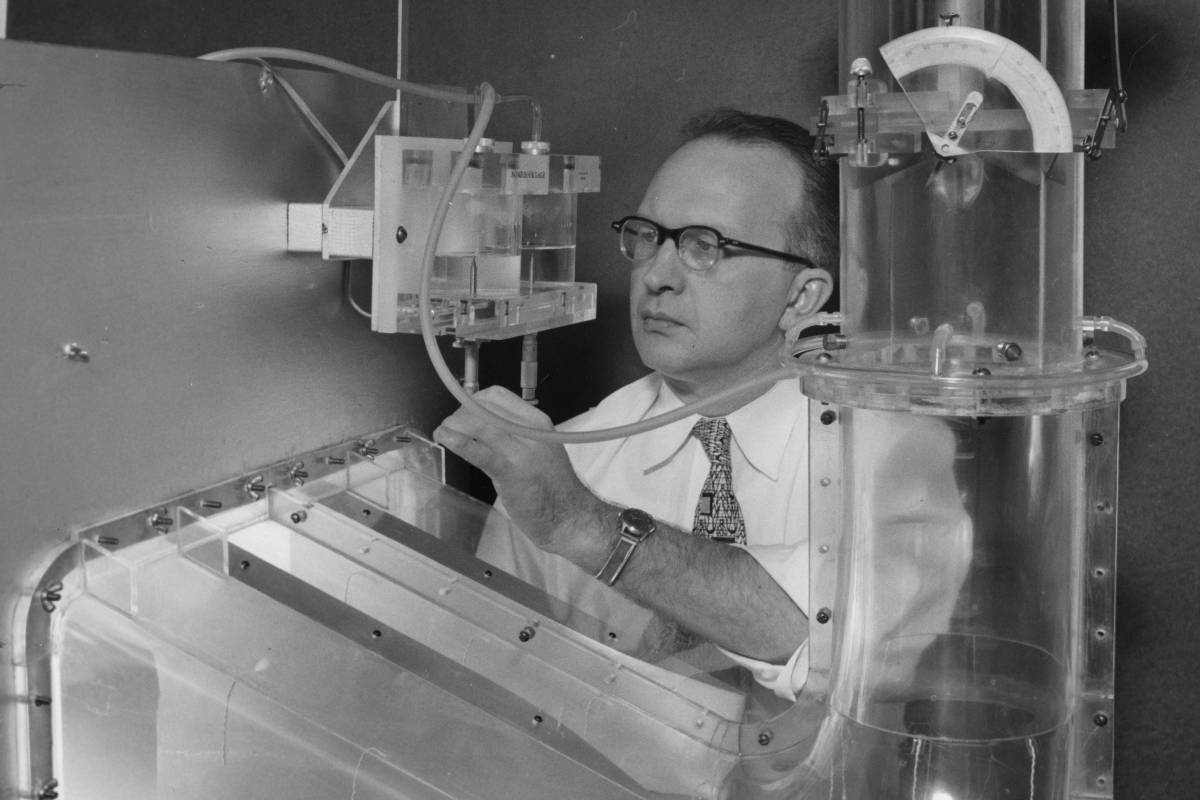 Carl Edward Kindsvater working on an experiment in the hydraulics laboratory. (Photo Courtesy of Georgia Tech Archives)