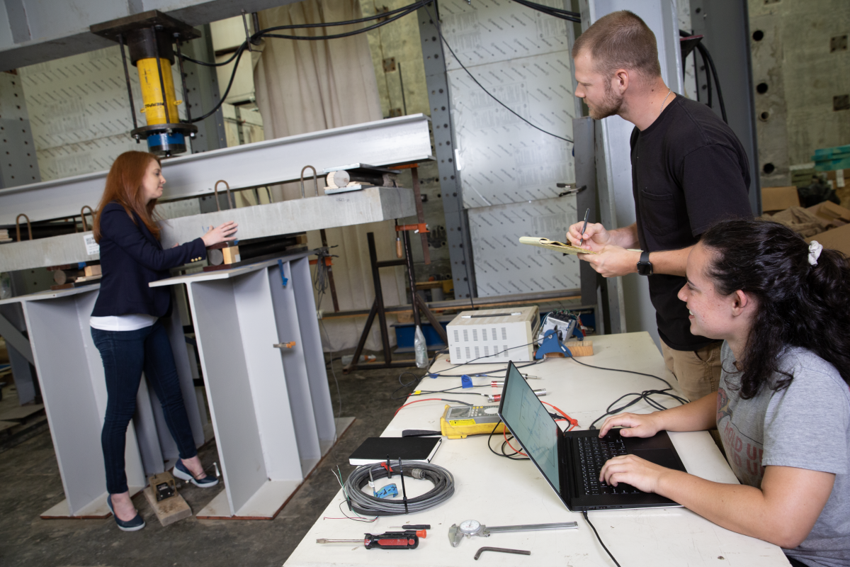 Williams Family Associate Professor Lauren Stewart works with graduate students in the structures lab.