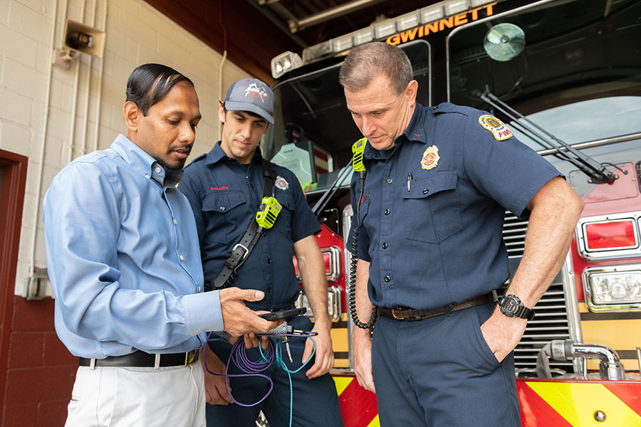![]() Angshuman Guin demonstrates how a cell phone tracks Gwinnett County Fire Department trucks and data about traffic to improve response times. Guin is working with Gwinnett on connected vehicle technology as part of the first round of Georgia Tech’s Georgia Smart Communities Challenge. (Photo: Allison Carter) |